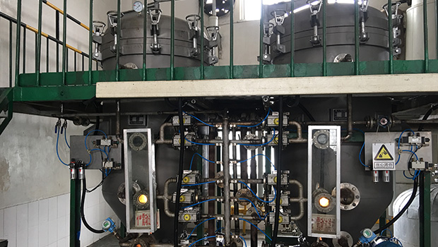 随着白土混合液过滤量的增加,滤饼层越来越厚,过滤阻力增加,罐内压力升高,当看到过滤机上部压力表显示为0.4Mpa时,停止向过滤机罐内输送白土混合液,开启空压机,通过管道经溢流口向过滤机罐内输入空气,在空气压力的作用下,滤饼中的油被逐渐压出,经管道回到脱色锅或搅拌罐,约30分钟以后,滤饼被压干,停止向过滤机内输入空气,当看到过滤机上部压力表显示为0时,打开蝶阀,启动振动体,开始排渣,当渣排净时,关闭蝶阀及所有阀门,开始下一轮过滤。